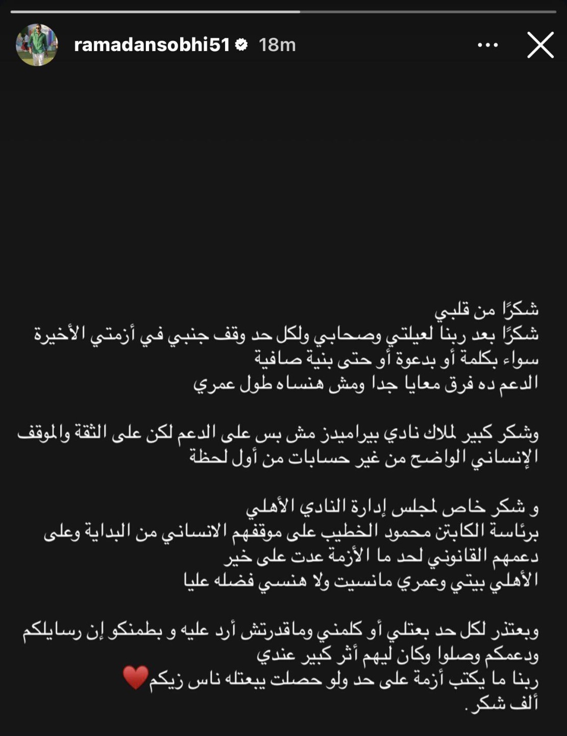 كما وجّه رمضان صبحي شكرًا خاصًا لمجلس إدارة النادي الأهلي، برئاسة الكابتن محمود الخطيب، على موقفهم الإنساني ودعمهم القانوني خلال الأزمة، مؤكدًا أن الأهلي سيظل بيته، وأن ما قدمه له النادي على مدار مسيرته لا يمكن نسيانه أو إنكاره.