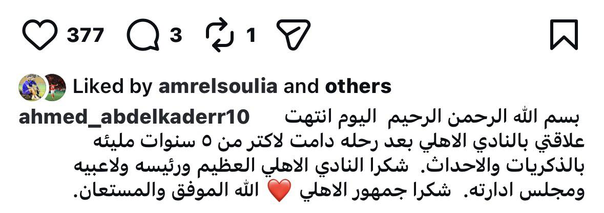 وحرص عبد القادر على توديع الأهلي وجماهيره برسالة مؤثرة عبر حسابه الرسمي على موقع «إنستجرام»، قال فيها: «بسم الله الرحمن الرحيم، اليوم انتهت علاقتي بالنادي الأهلي بعد رحلة دامت لأكثر من 5 سنوات مليئة بالذكريات والأحداث. شكرًا للنادي الأهلي العظيم ورئيسه ولاعبيه ومجلس إدارته.. شكرًا جمهور الأهلي».