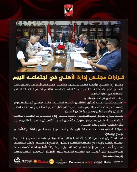 عقد مجلس إدارة النادي الأهلي برئاسة محمود الخطيب اجتماعًا مهمًا مساء اليوم داخل مقر النادي بالجزيرة، في توقيت بالغ الحساسية، لمناقشة عدد من الملفات الإدارية والتنظيمية التي تمس مختلف قطاعات القلعة الحمراء، ضمن خطة شاملة لإعادة هيكلة العمل المؤسسي خلال المرحلة المقبلة.